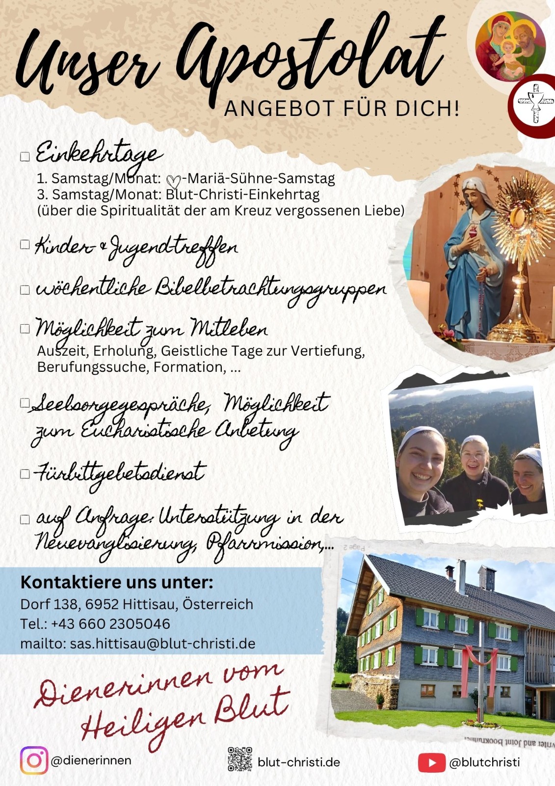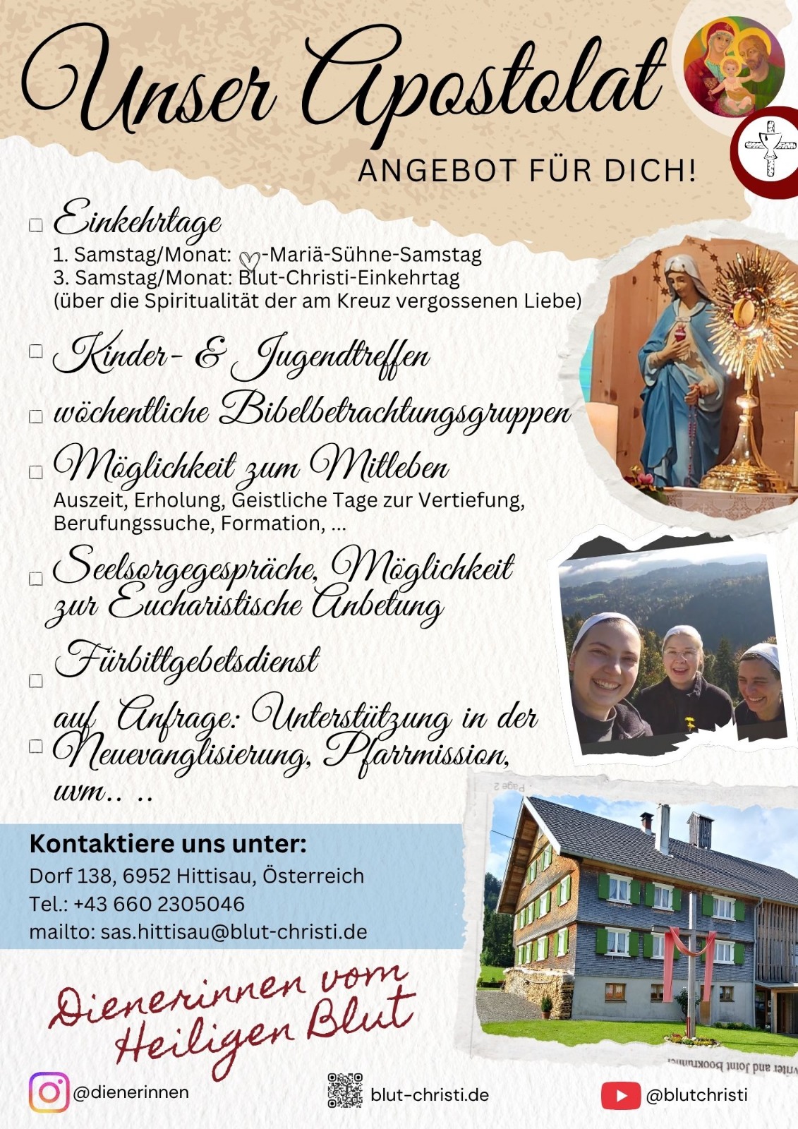 Facebook: https://www.facebook.com/dienerinnen.vom.heiligen.blut - Blut-Christi-Rosenkranz: donnerstags, 17 Uhr in der Kreuzkirche in Heiligenkreuz – Flyer