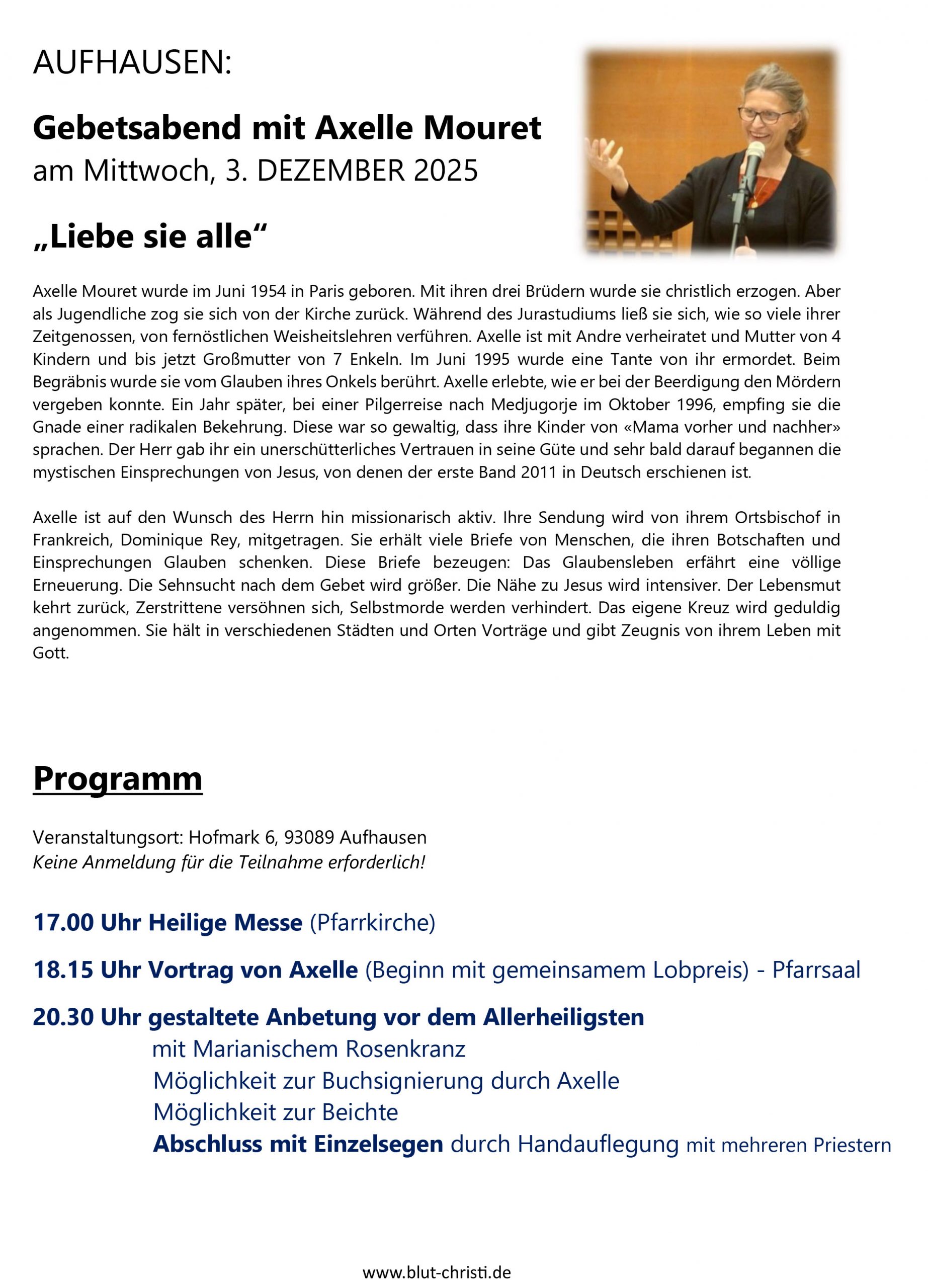 - Eucharistische Anbetung (24-Stundengebet) – Wir suchen Anbeter, die feste Stunden übernehmen möchten (sas.aufhausen(at)blut-christi.de)