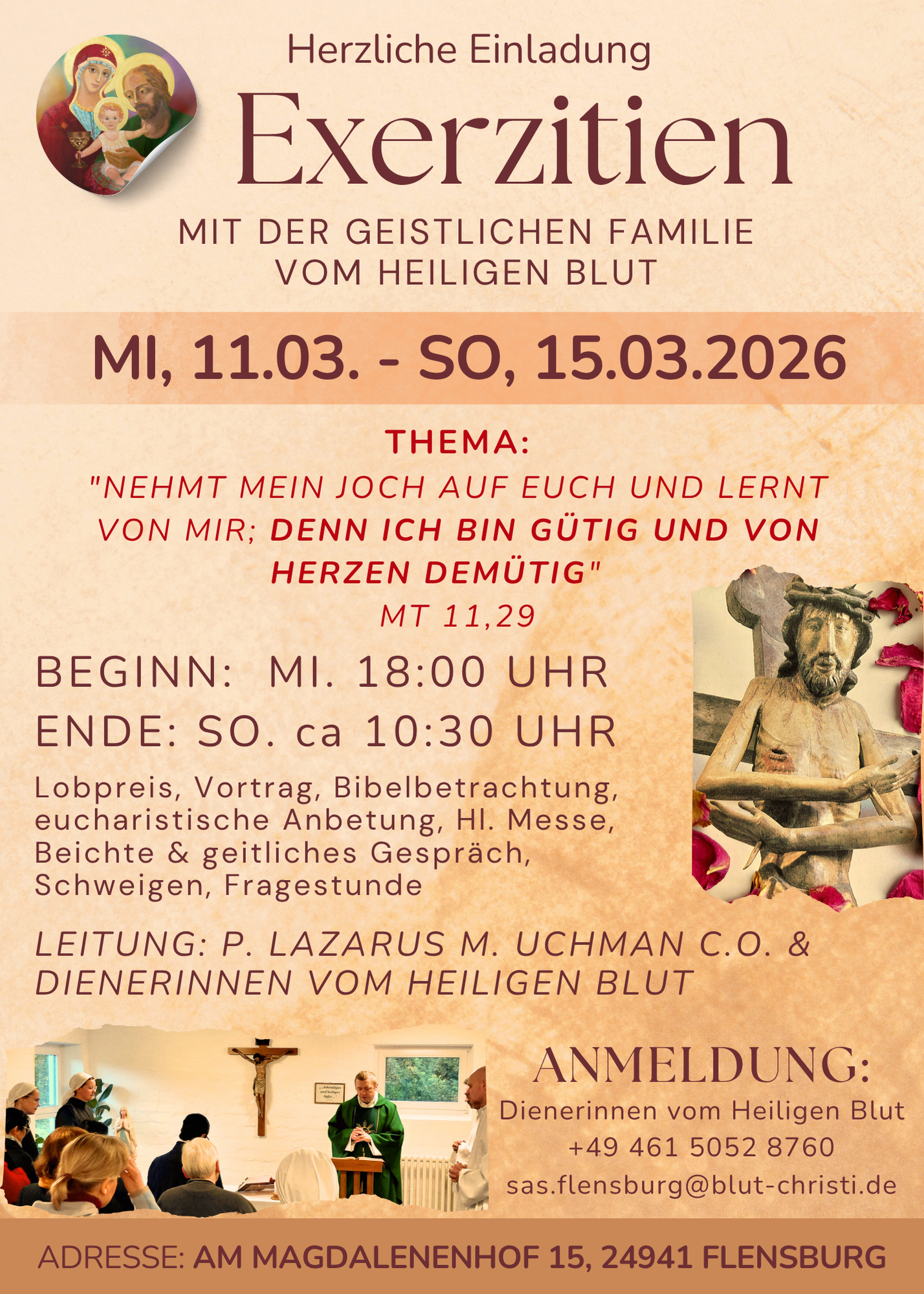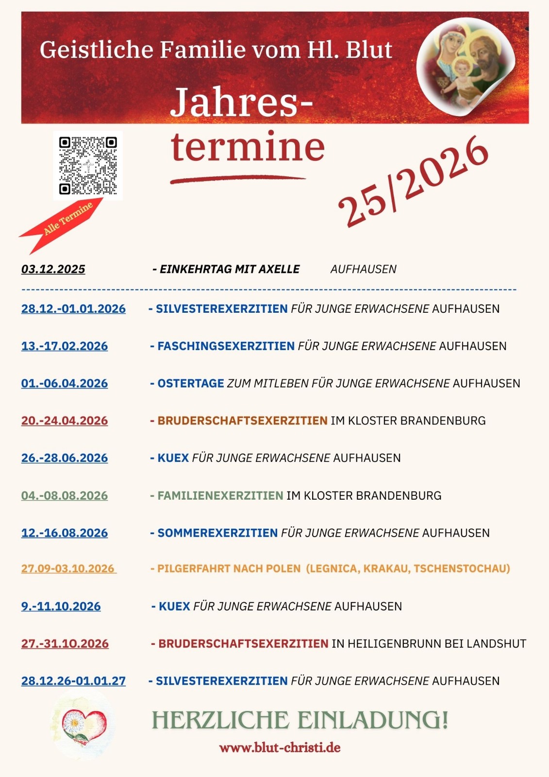 - 20.-24.4.26: Exerzitien für die Bruderschaft vom Heiligen Blut im Kloster Brandenburg