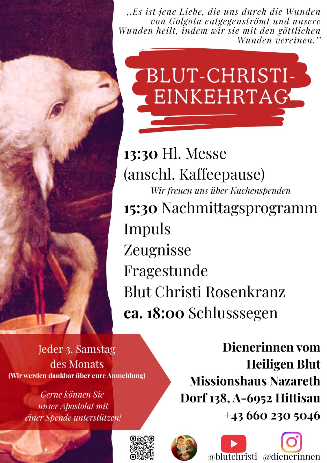 - Einkehrtag zur Ehre des kostbaren Blutes: jeden dritten Samstag im Monat, Beginn um 15 Uhr (für Mitglieder der Bruderschaft ist schon ein Treffen um 14 Uhr)