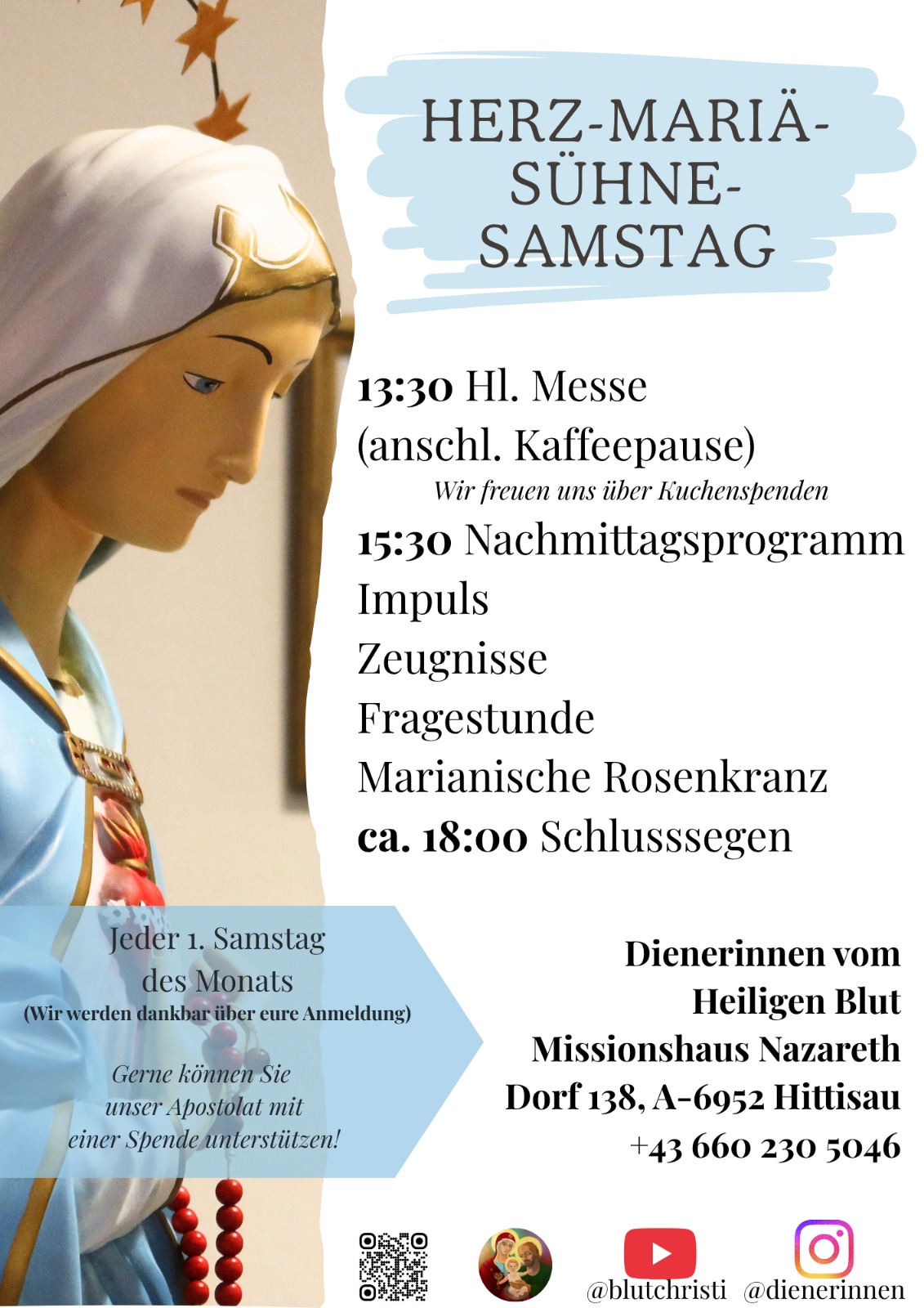 - 8.11., 6.12.: Herz-Mariä-Sühne-Samstag: ab 15.30 Uhr, Beginn mit der Hl. Messe