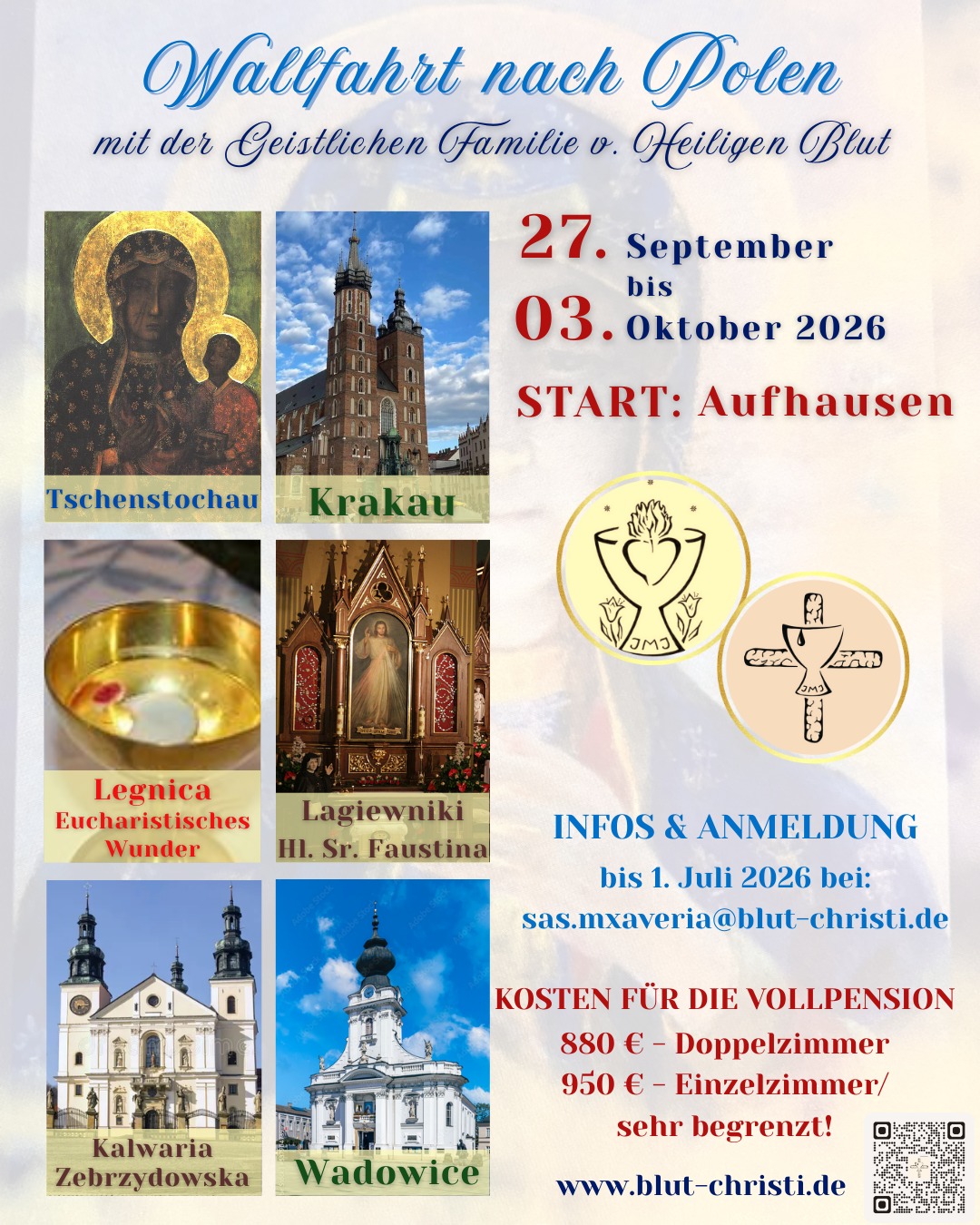 - 27.9.-3.10.26: Wallfahrt nach Polen mit der Geistlichen Familie vom Heiligen Blut – Flyer