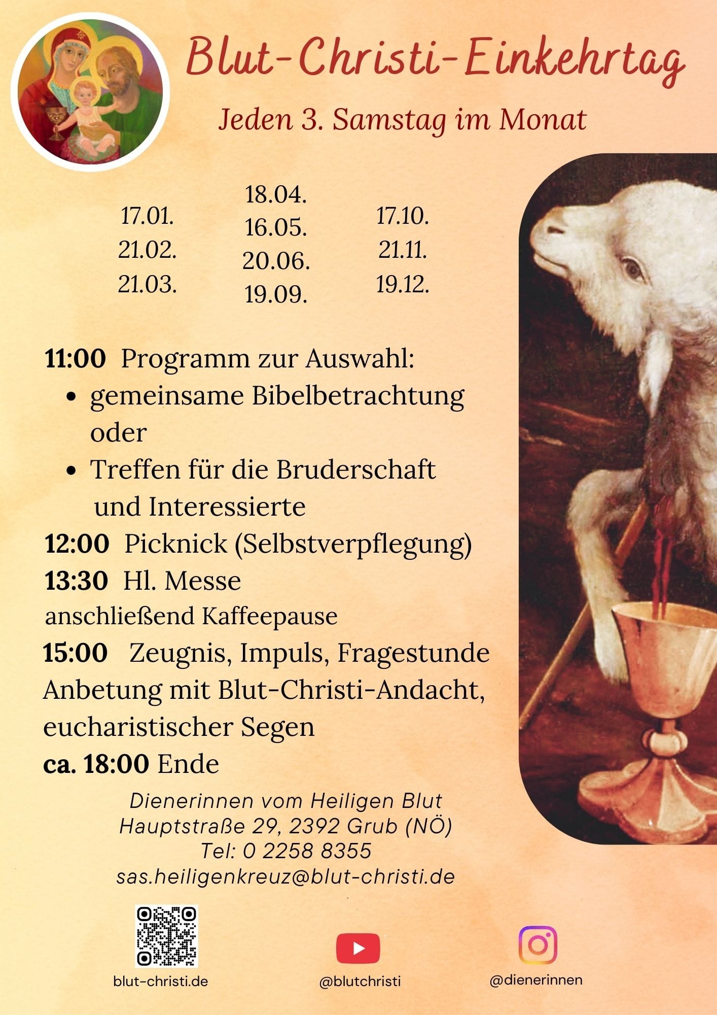 Jede Woche auch im Livestream: https://stift-heiligenkreuz.global.ssl.fastly.net/kreuzkirche/ - Blut-Christi-Einkehrtag: jeweils am 3. Samstag im Monat – Flyer