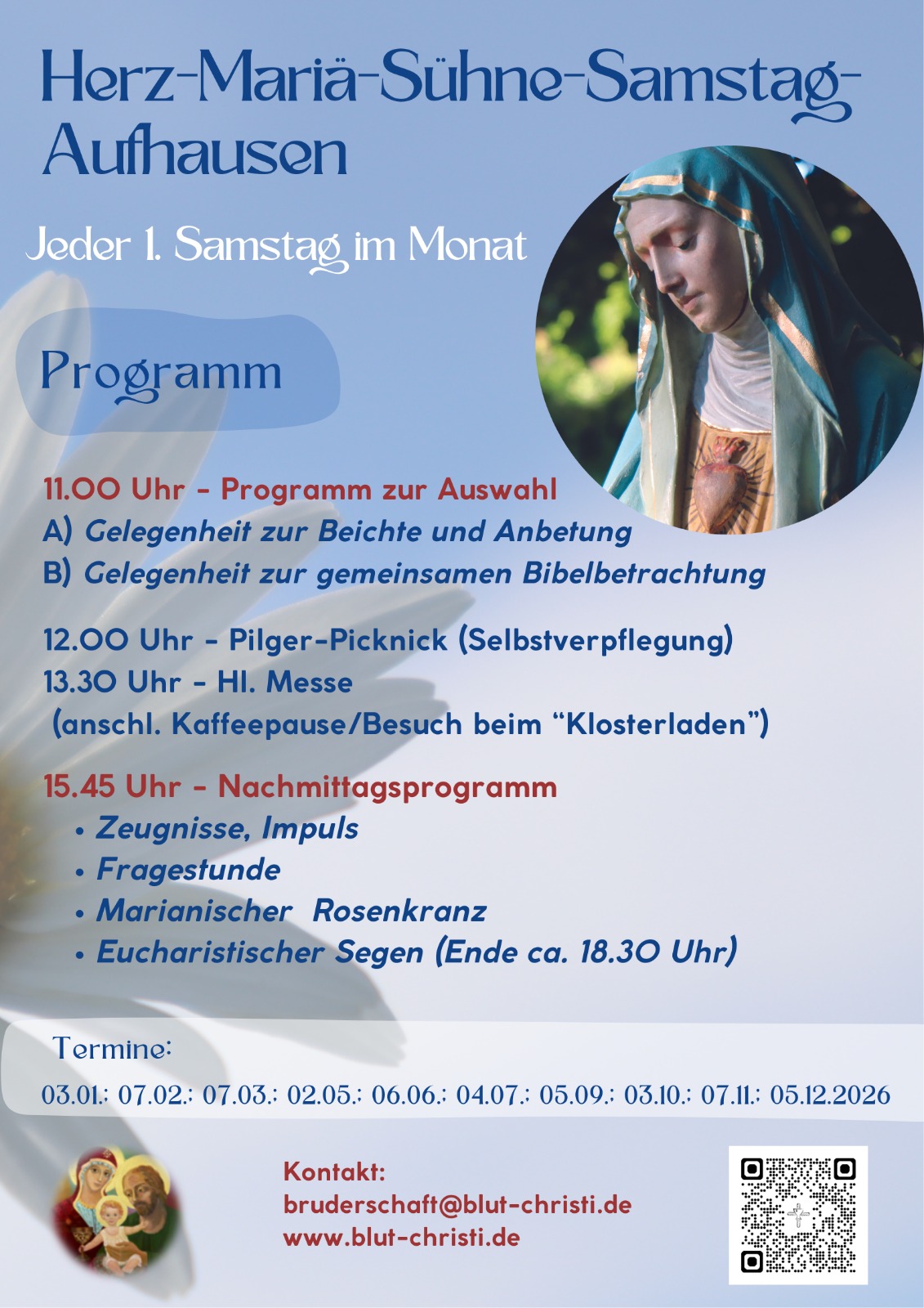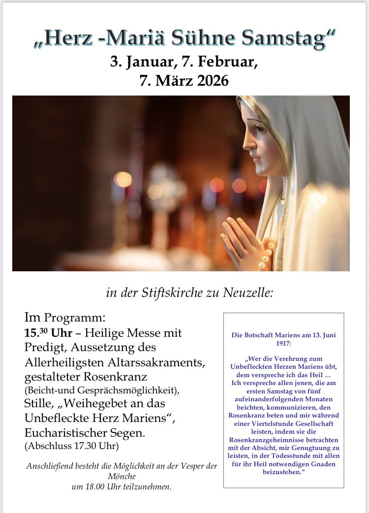 - Herz-Mariä-Sühne-Samstag: ab 15.30 Uhr, Beginn mit der Hl. Messe – Flyer