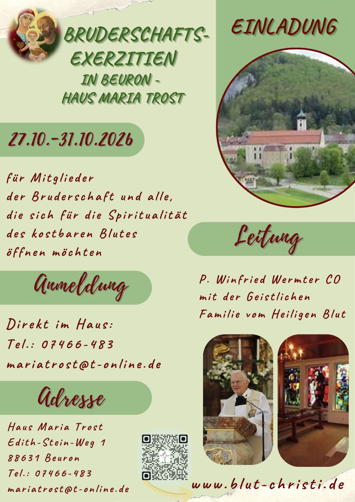 - 27.-31.10.26: Exerzitien für die Bruderschaft vom Heiligen Blut in Beuron (Haus Maria Trost) – Flyer